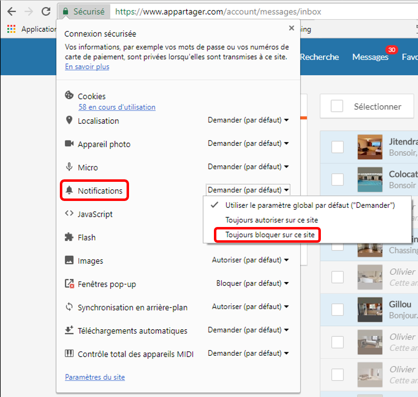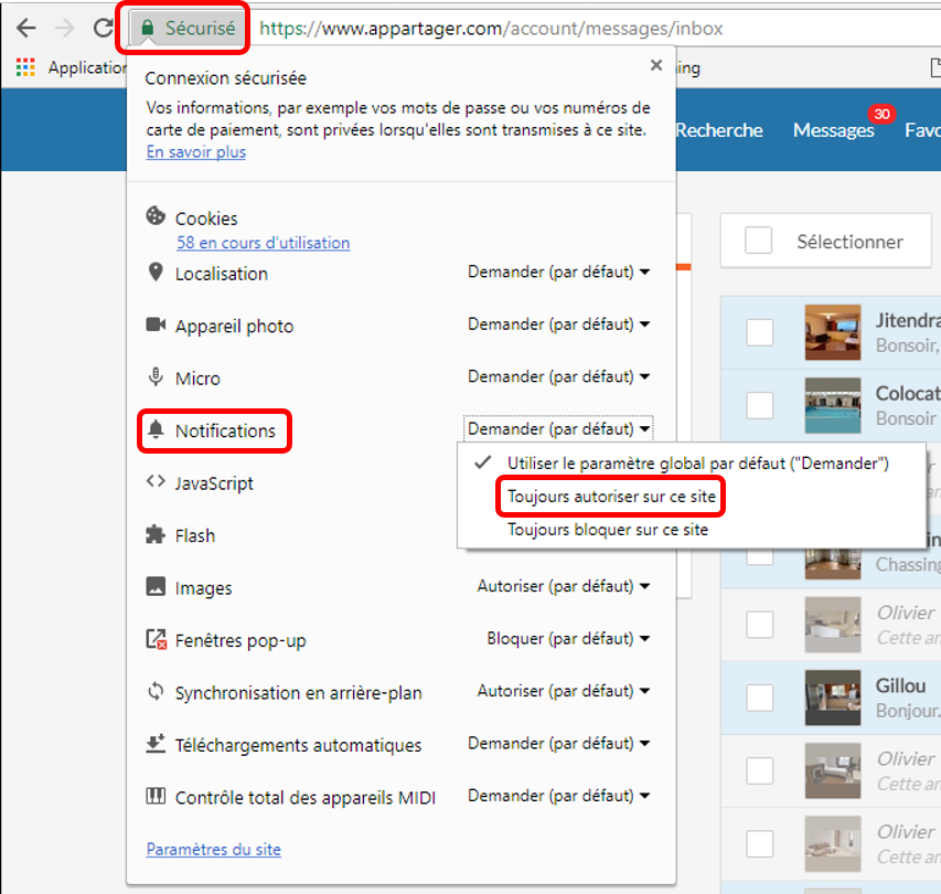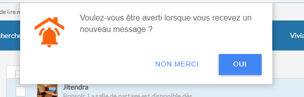 La première fois que vous allez dans votre messagerie Appartager, vous verrez une petite fenêtre vous demandant si vous souhaitez autoriser cette notification sur votre appareil.