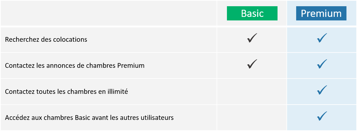 Que vous cherchiez ou que vous offriez une chambre, vous pouvez utiliser Appartager sans dépenser. Mais pour ceux qui veulent accélérer le processus, nous offrons la possibilité d’acquérir un pass Premium.
